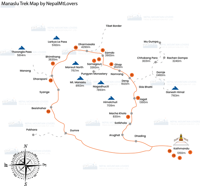 - Stunning Views of Mount Manaslu (8,163m) and surrounding peaks like Annapurna Cultural Immersion in Tibetan villages like Samagaon and Lho, with Buddhist monasteries.
